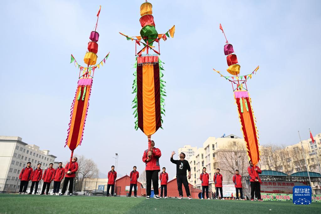 3月20日,隆化縣職教中心學(xué)生在練習河北省級非遺項目“隆化中幡”。
