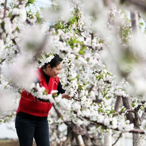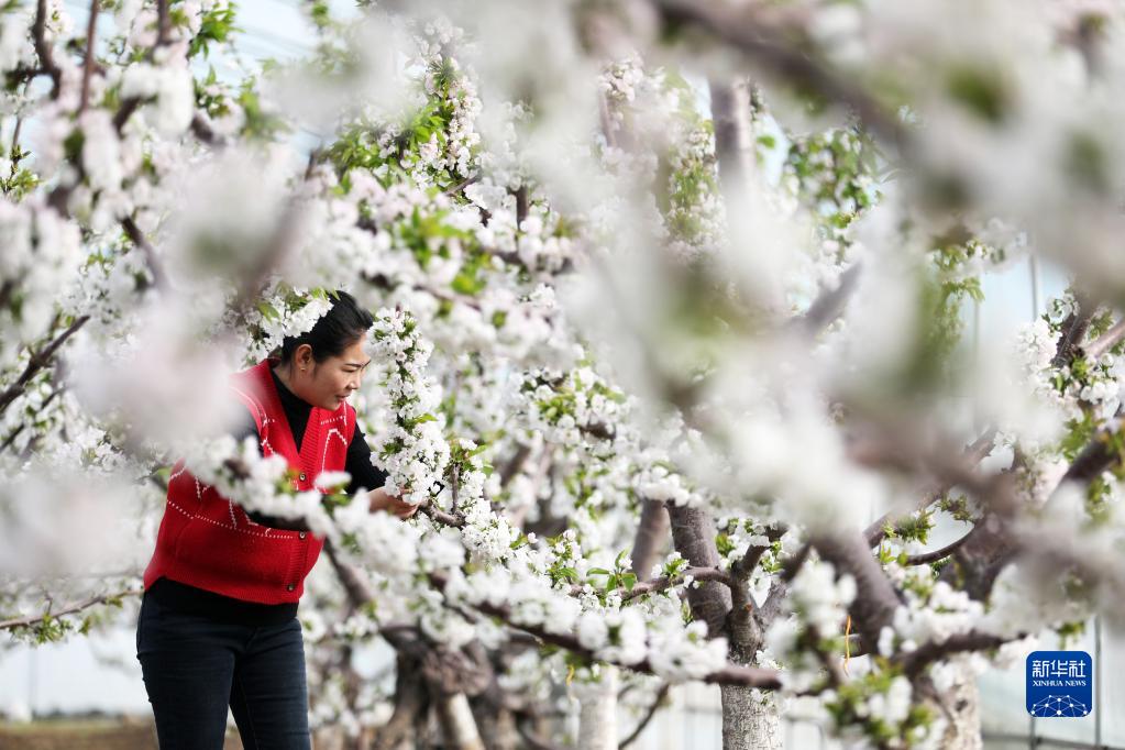 3月20日,山東省臨沂市郯城縣郯城街道薛城后村村民在大櫻桃棚內勞作。