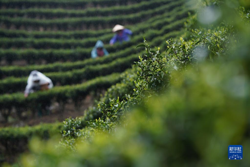 3月20日,在湖南省懷化市通道侗族自治縣菁蕪洲鎮地連村,茶農在茶場(chǎng)采茶。