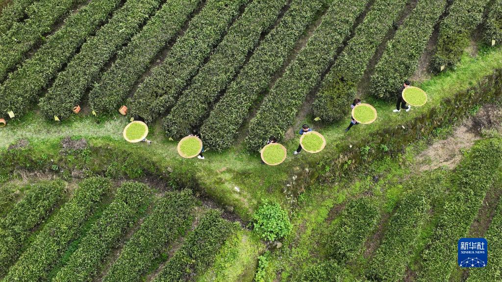 3月20日,在湖南衡陽(yáng)常寧市塔山瑤族鄉,茶農在茶園采茶(無(wú)人機照片)。