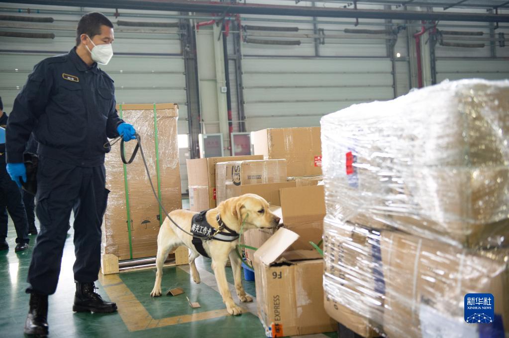3月20日,首都機場(chǎng)海關(guān)關(guān)員使用檢疫犬在海關(guān)監管的快件倉庫查驗快件。