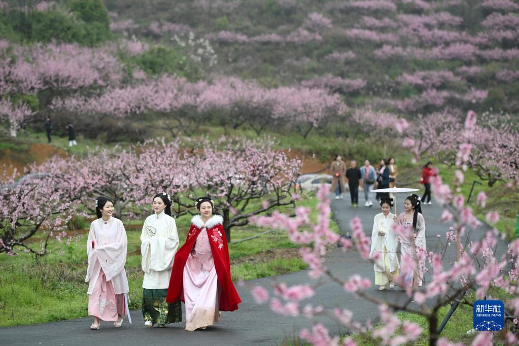 3月20日,游客在湖南省郴州市安仁縣永樂(lè )江鎮東周村游玩賞花。