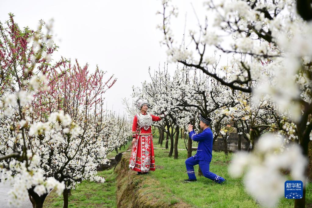 3月20日,在湖南省邵陽(yáng)市城步苗族自治縣儒林鎮塔溪村,游客在香梨基地賞花拍照。
