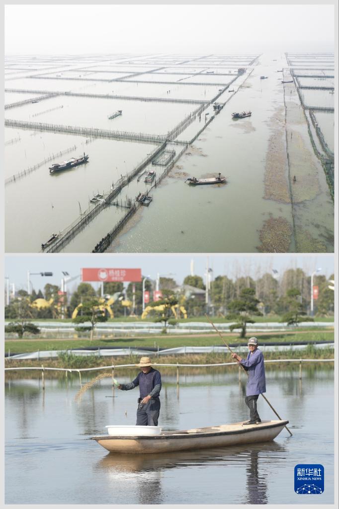 為改善太湖水質(zhì),2019年太湖完成“退蟹還湖”,在太湖水域圍網(wǎng)養殖的大閘蟹全部搬遷至內塘養殖。上圖:太湖上的大閘蟹養殖圍網(wǎng)(2018年10月17日攝,無(wú)人機照片);下圖:在太湖南岸的浙江湖州吳興區楊桂珍螃蟹莊園,工作人員在標準化養殖基地內喂養蟹苗(2023年3月15日攝)。