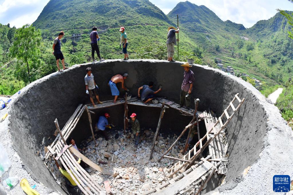 在廣西大化瑤族自治縣板升鄉弄勇村,村民在修建家庭水柜(2017年9月2日攝)。