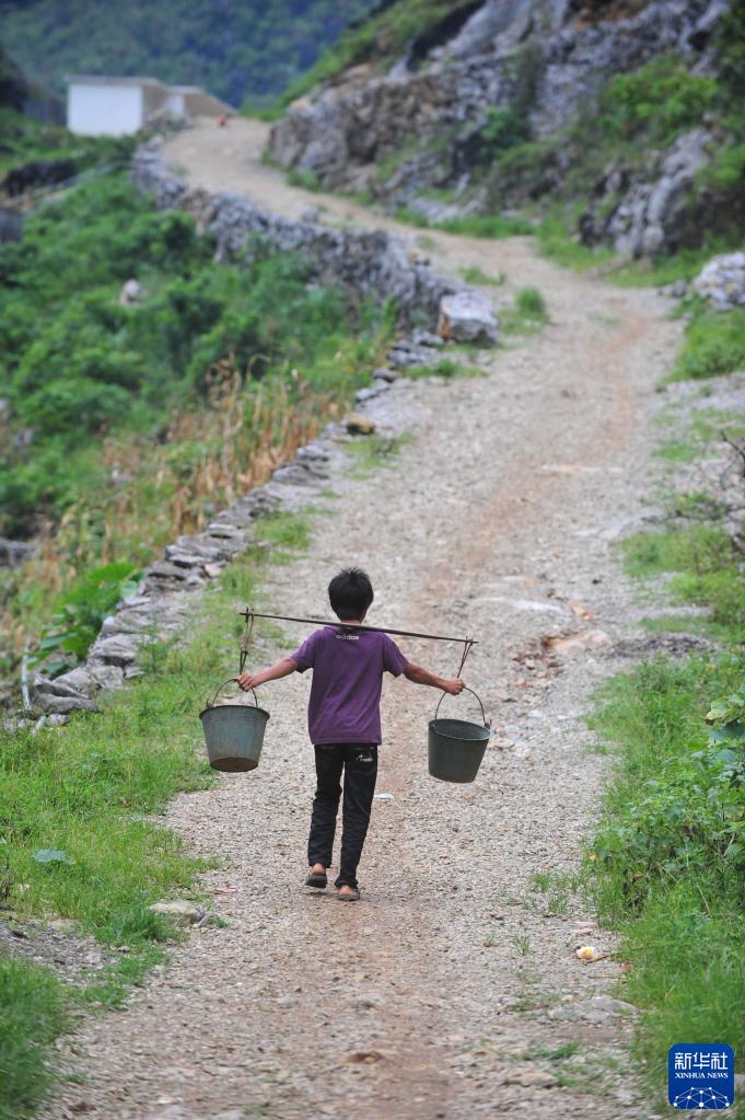 在廣西大化瑤族自治縣板升鄉弄勇村,村民去山上挑水(2012年7月16日攝)。