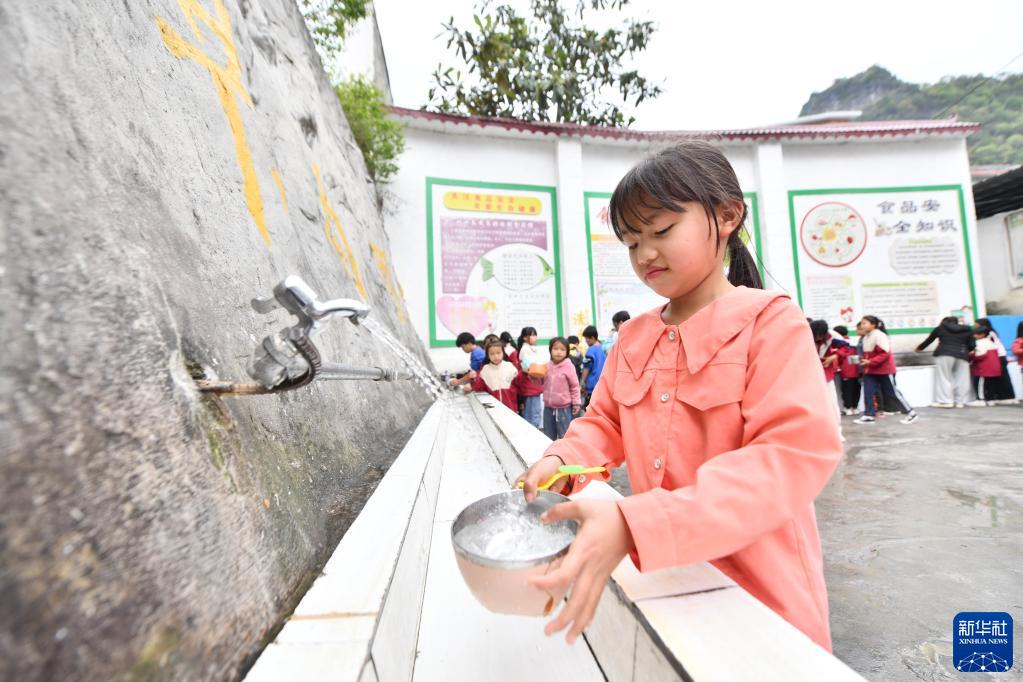 在廣西大化瑤族自治縣板升鄉八好小學(xué),學(xué)生們用自來(lái)水洗碗(2023年3月20日)。十幾年前,學(xué)校僅有一個(gè)不足100立方米的水柜,用于收集儲存樓頂的雨水,學(xué)生用水要定期定量,遇到長(cháng)時(shí)間不下雨,學(xué)校要到鄉政府所在地運水。2021年,當地抗旱應急供水工程投入使用,學(xué)校用上了十幾公里外的紅水河水,飲水難的問(wèn)題得到徹底解決。