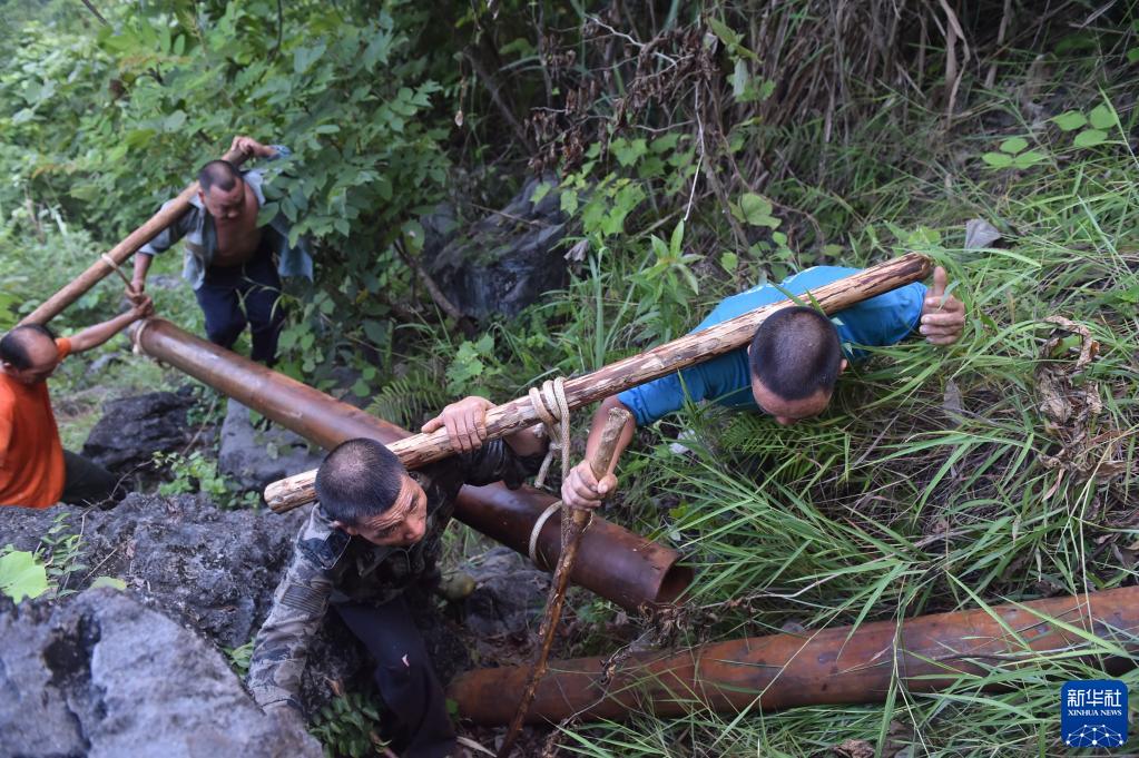 在廣西大化瑤族自治縣板升鄉弄雷村,村民們抬著(zhù)抗旱應急供水工程的水管在山路上前行(2016年8月18日攝)。
