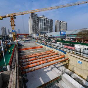 3月21日,在成都地鐵27號線(xiàn)金府站,中建三局的施工人員在指揮塔吊吊裝混凝土。