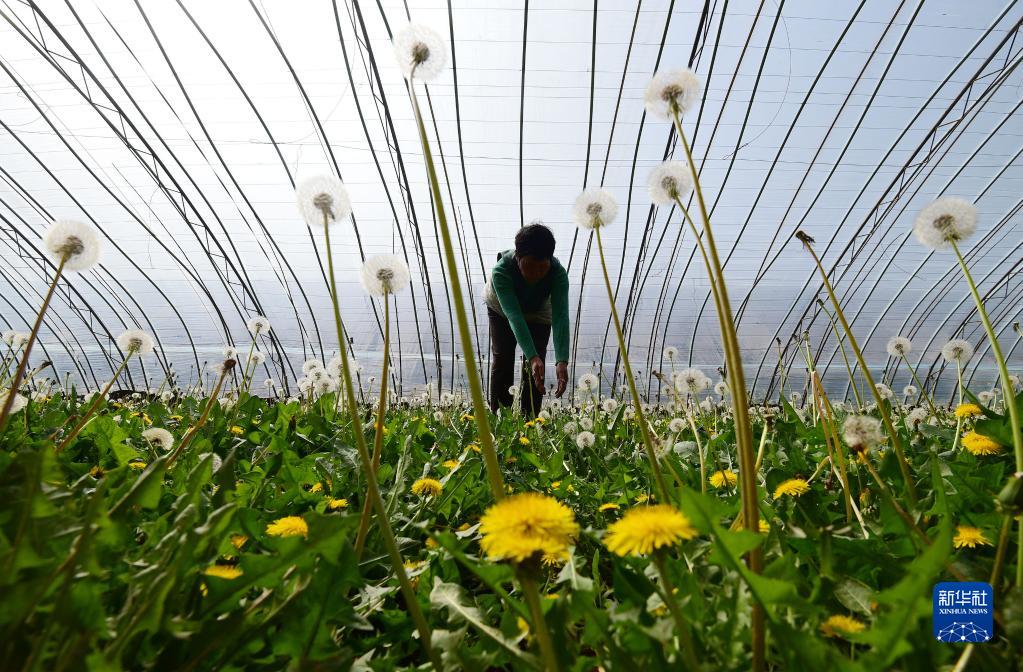 3月21日,河北省邯鄲市磁縣講武城鎮八里冢村農民在蒲公英種植基地采收蒲公英種子。