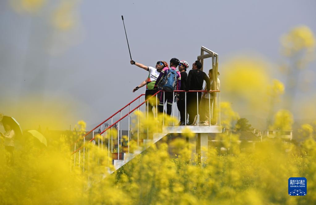 3月21日,游人在湖南省郴州市安仁縣“稻田公園”里賞花自拍。