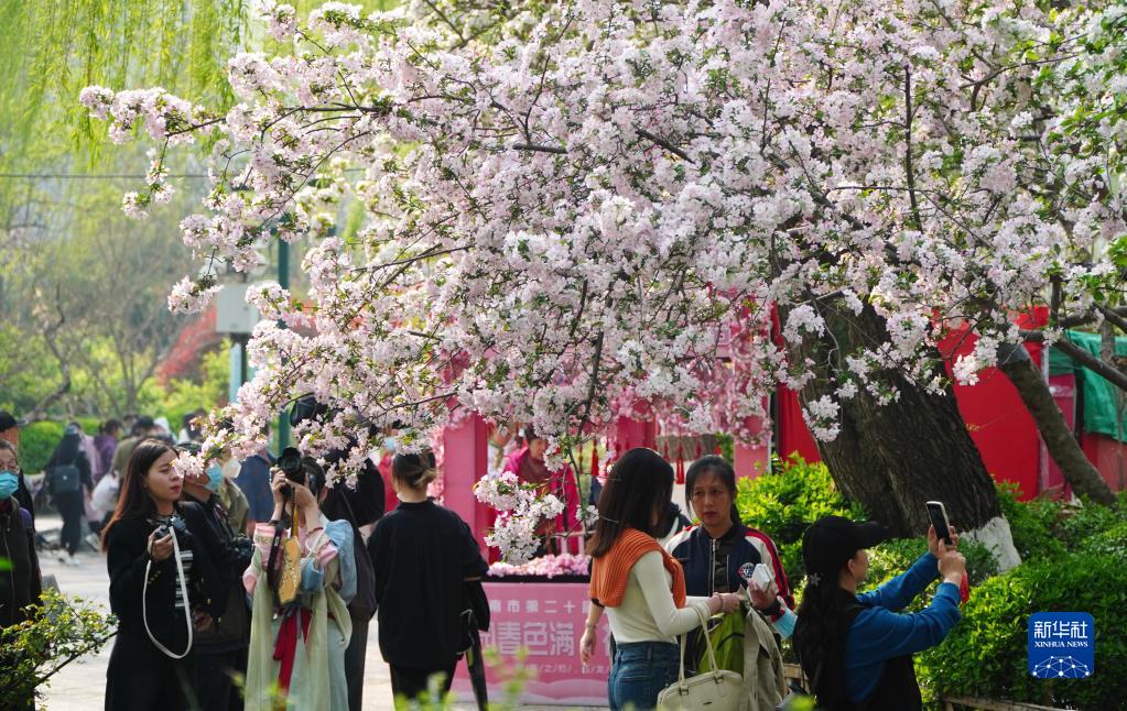 3月21日,在濟南市五龍潭公園,人們觀(guān)賞盛開(kāi)的海棠花。