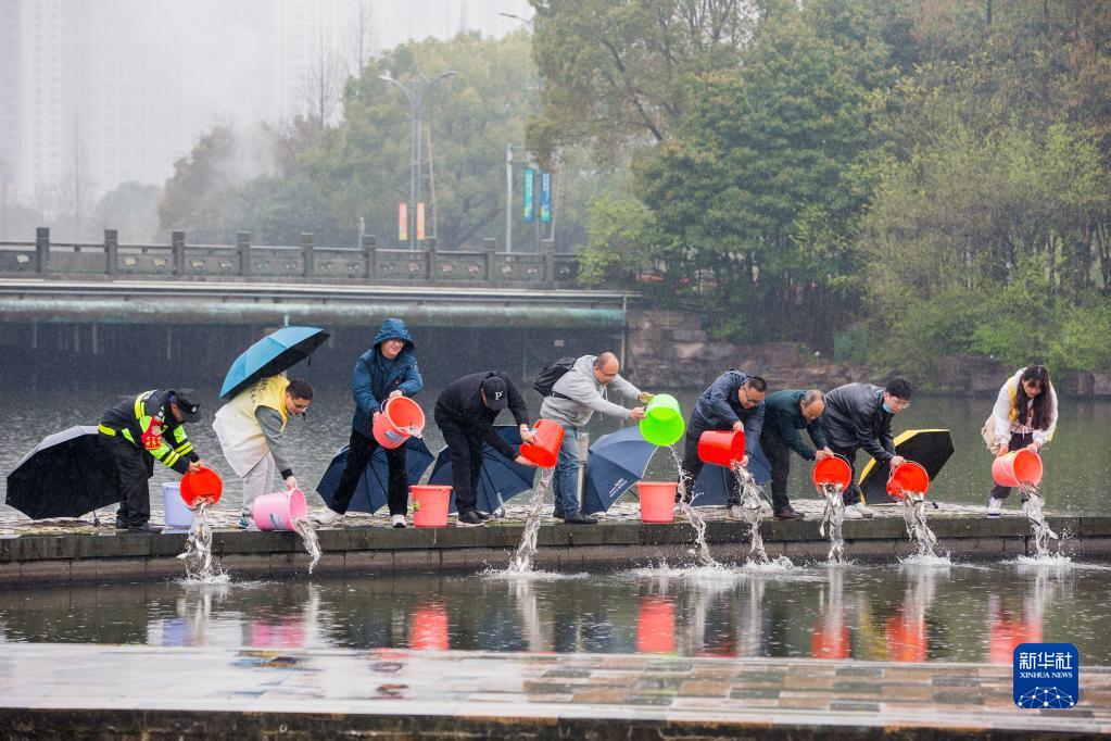 3月21日,在浙江省寧波市北侖區中心公園旁,志愿者向東泰河放流魚(yú)苗。