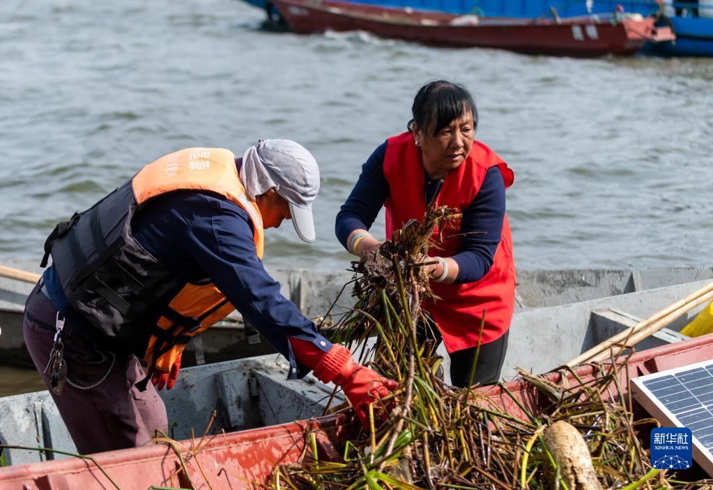 3月20日,李云麗(右)將打撈的枯枝落葉等交給工作人員處理。