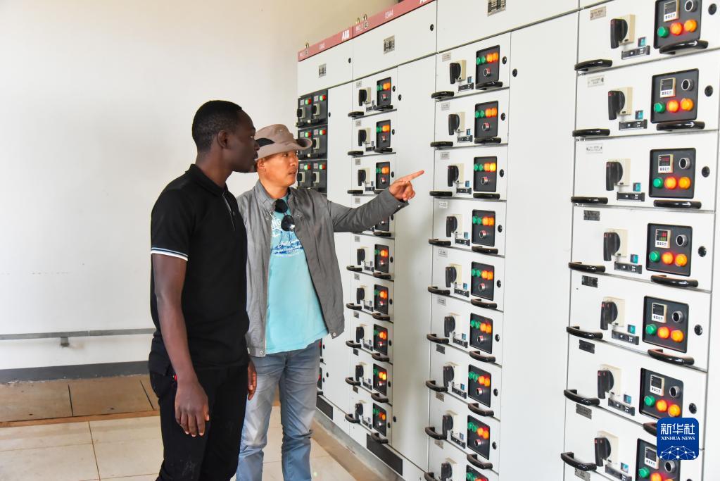 3月2日,中喀工作人員在喀麥隆西部大區的巴富薩姆飲用水處理廠(chǎng)的配電間交流。