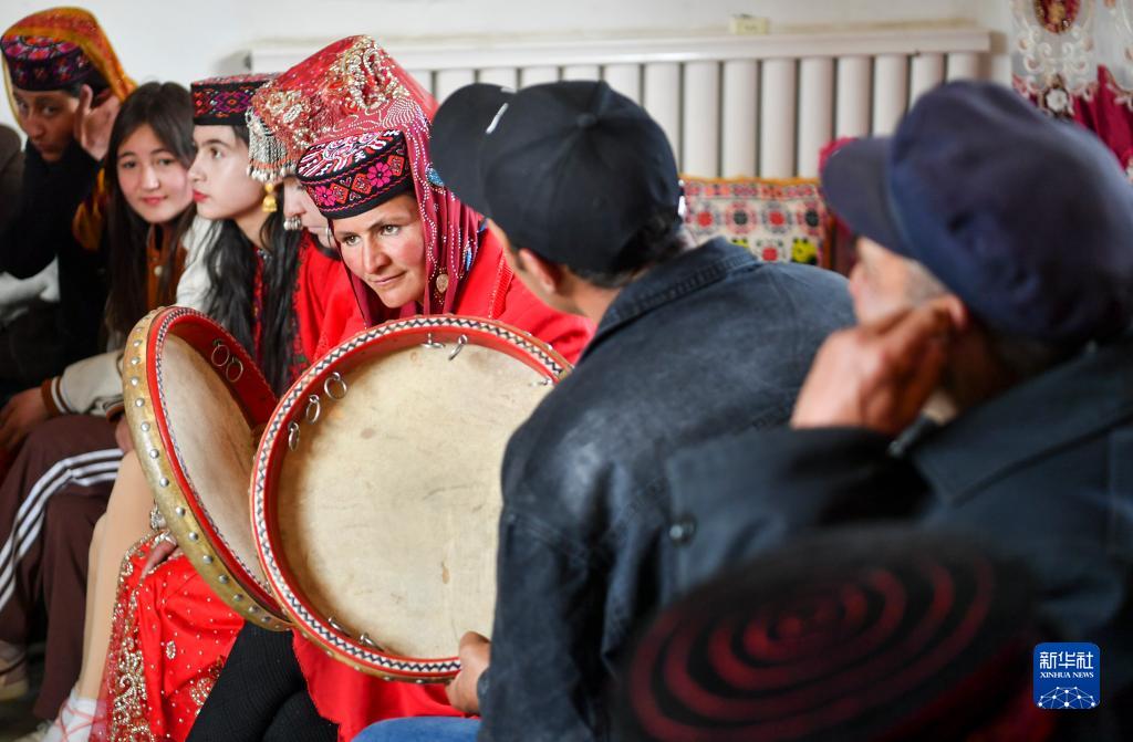 新娘古麗汗·贊加比力的親友在家中打手鼓、唱歌慶祝(3月18日攝)。