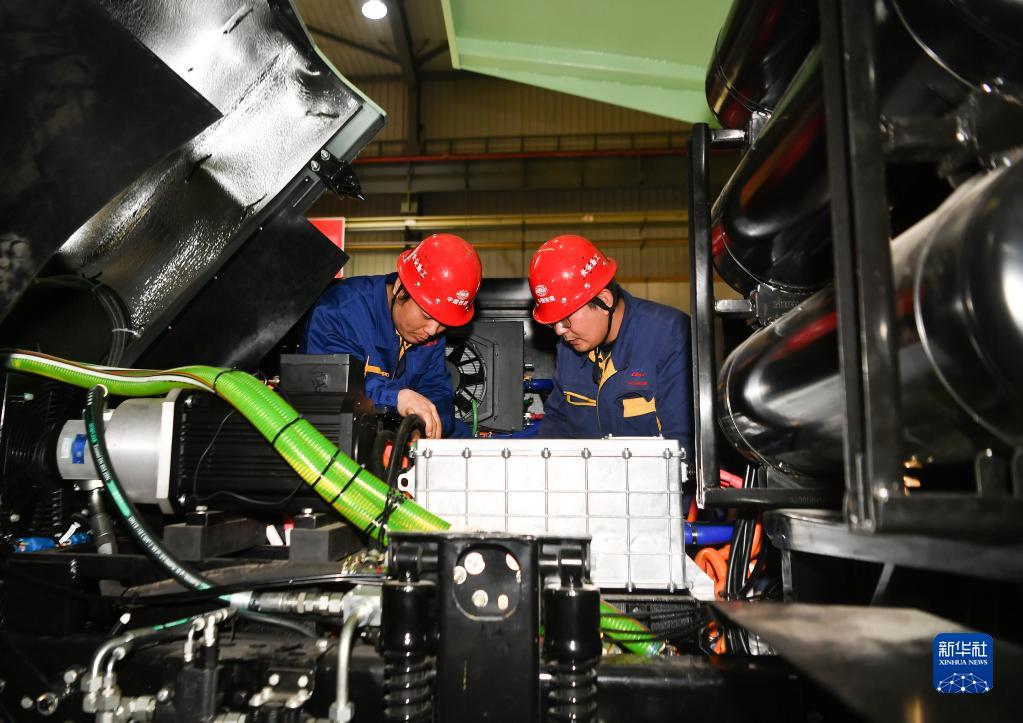 3月22日,中鐵長(cháng)安重工有限公司的工人在生產(chǎn)線(xiàn)上調試即將下線(xiàn)的95噸純電動(dòng)礦用自卸車(chē)。