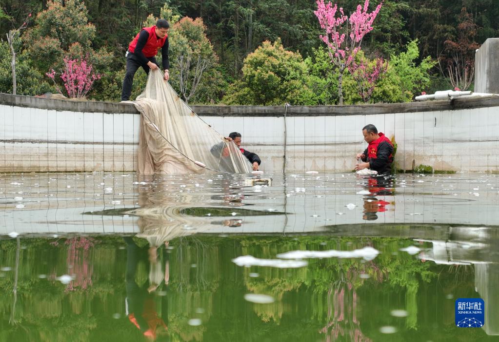 3月22日,衡山縣嶺坡鄉燈山村泉水魚(yú)養殖基地工作人員在捕魚(yú)。