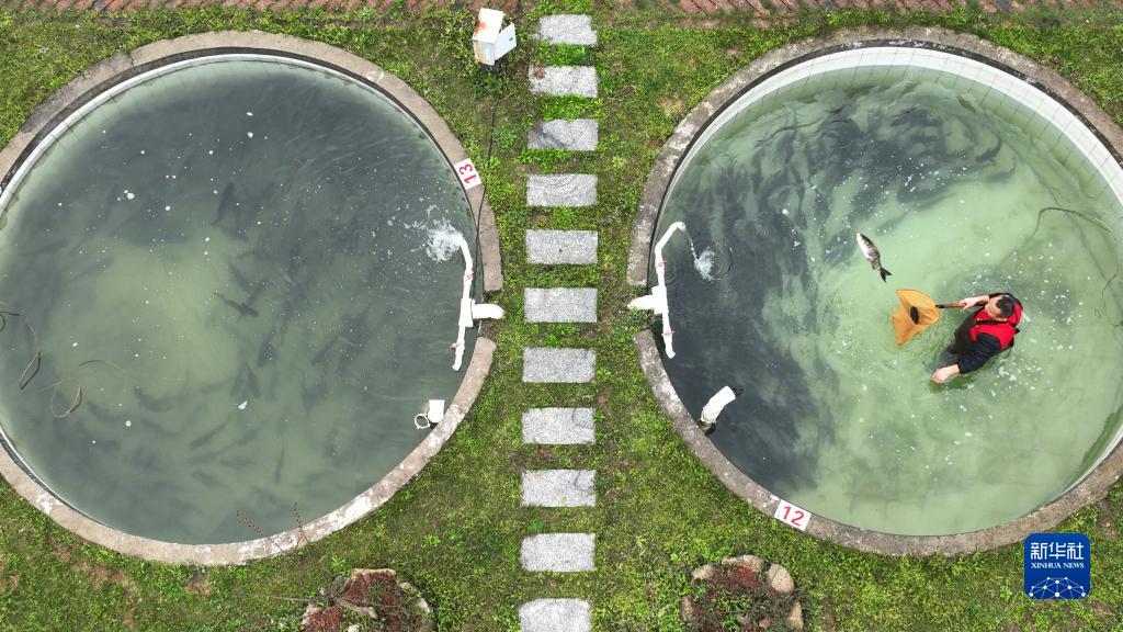 3月22日,衡山縣嶺坡鄉燈山村泉水魚(yú)養殖基地工作人員在捕魚(yú)(無(wú)人機照片)。