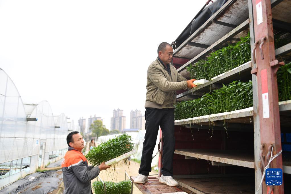 3月22日,農美種苗產(chǎn)業(yè)園工作人員將辣椒苗裝車(chē)。