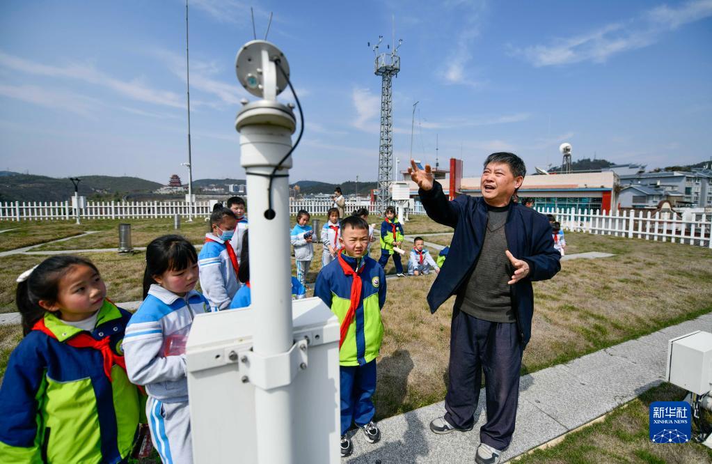 3月22日,工作人員在貴州福泉國家氣象觀(guān)測站向學(xué)生介紹氣象設備知識。