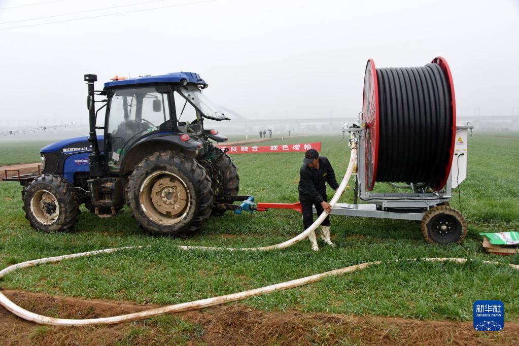 3月22日,青島市西海岸新區大場(chǎng)鎮小麥生產(chǎn)基地,同富勤耕農機合作社技術(shù)人員在進(jìn)行灌溉設備演示。
