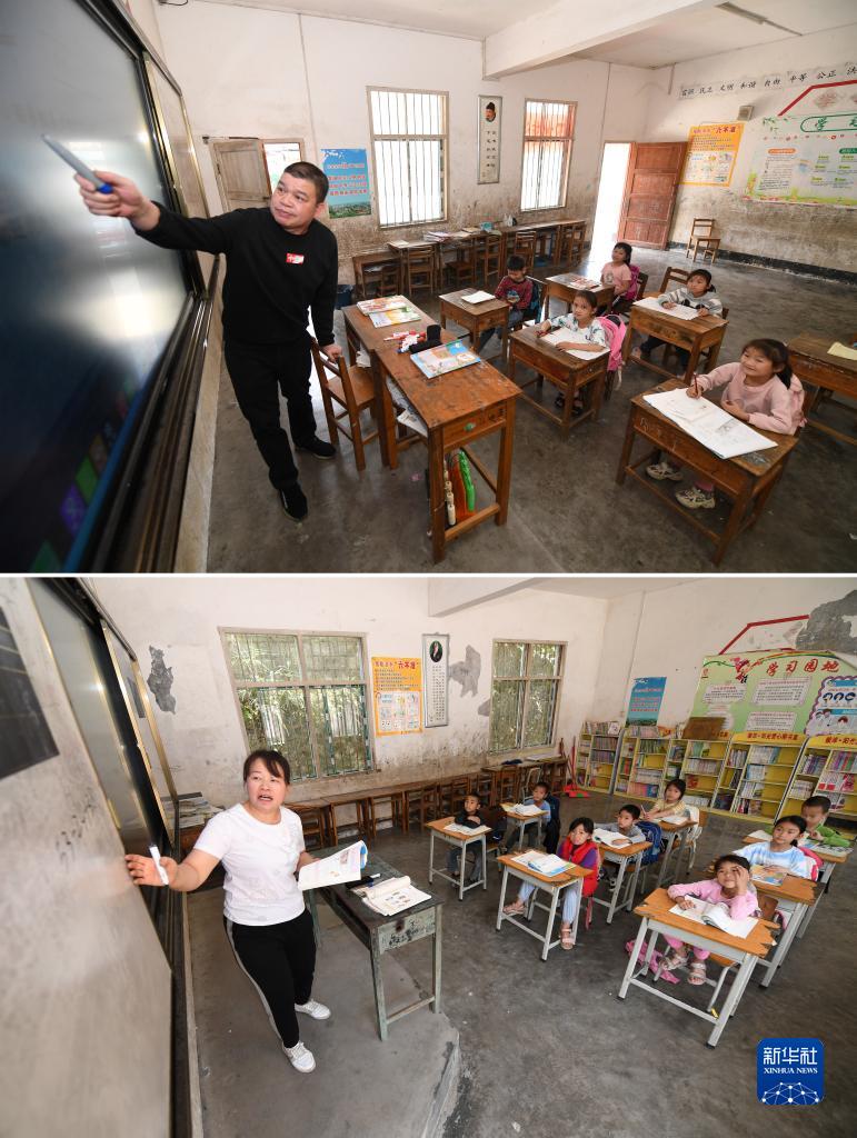 這是一張拼版照片:在廣西德??h東凌鎮那王小學(xué),黃永勇(上圖)和黃秀碧(下圖)在給學(xué)生上課(3月22日攝)。
