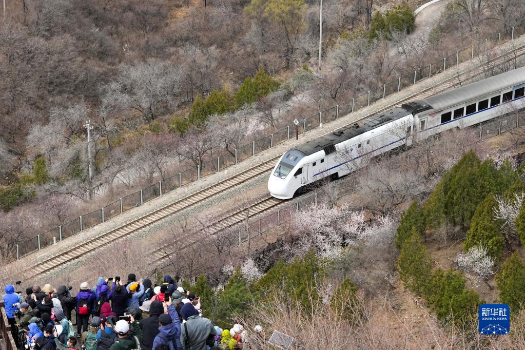 近日,北京居庸關(guān)長(cháng)城腳下山花漸次開(kāi)放。北京市郊鐵路S2線(xiàn)列車(chē)穿行于花海間,成為春日里一道美麗的風(fēng)景。