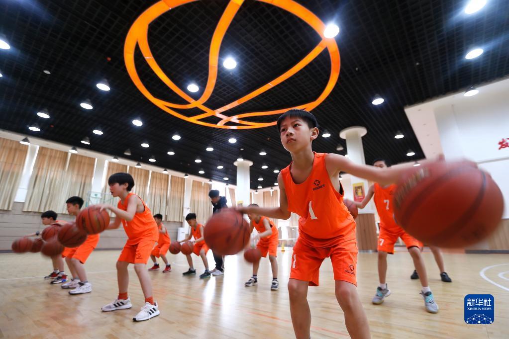 3月23日,青島市通濟實(shí)驗學(xué)校的學(xué)生在大課間進(jìn)行籃球運球訓練。