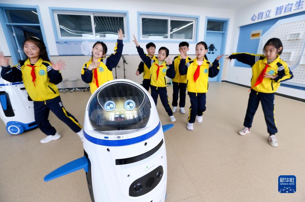 3月23日,青島市通濟實(shí)驗學(xué)校的學(xué)生在大課間跟隨機器人一起跳舞。