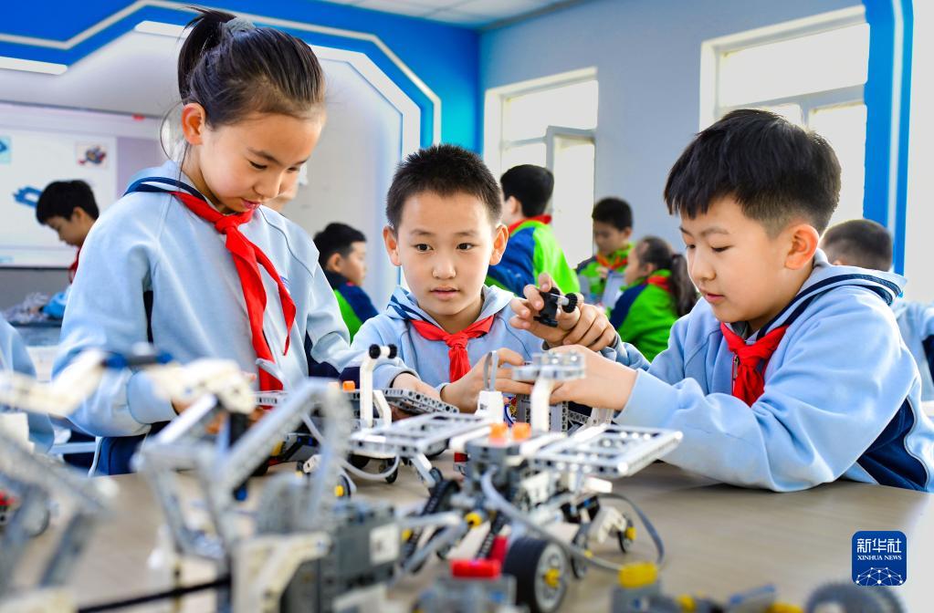 3月23日,呼和浩特市賽罕區大學(xué)路小學(xué)教育集團西把柵校區學(xué)生拼裝遙控機器人。