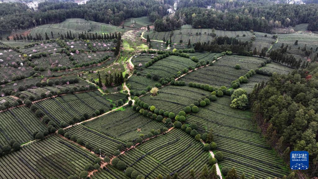 3月23日拍攝的鳳岡縣永安鎮田壩社區生態(tài)茶園基地(無(wú)人機照片)。