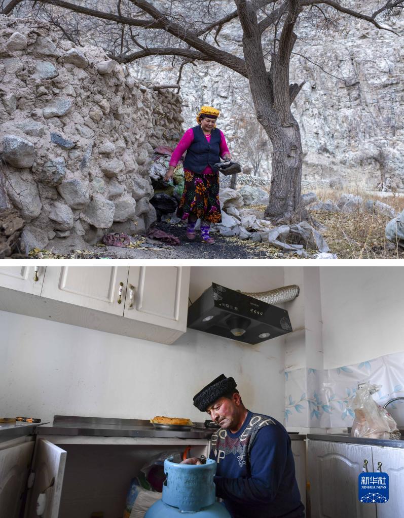這是一張拼版照片,上圖為搬遷前,都熱·加爾曼的妻子那尼克·苦卡尼在山谷舊居中拿煤炭準備生火做飯(2018年11月16日攝);下圖為在愛(ài)民村新家廚房,都熱·加爾曼在修理液化氣罐(2020年6月3日攝)。