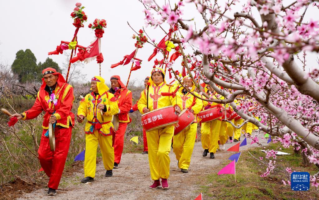 3月24日,在陜西省西安市臨潼區零口街道零塬村,當地的非物質(zhì)文化遺產(chǎn)“百面鑼鼓”隊伍穿行于桃園中。