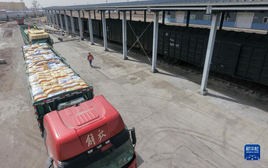 3月23日,管宏勃在寧安站貨場(chǎng)檢查線(xiàn)路及車(chē)輛狀態(tài)(無(wú)人機照片)。