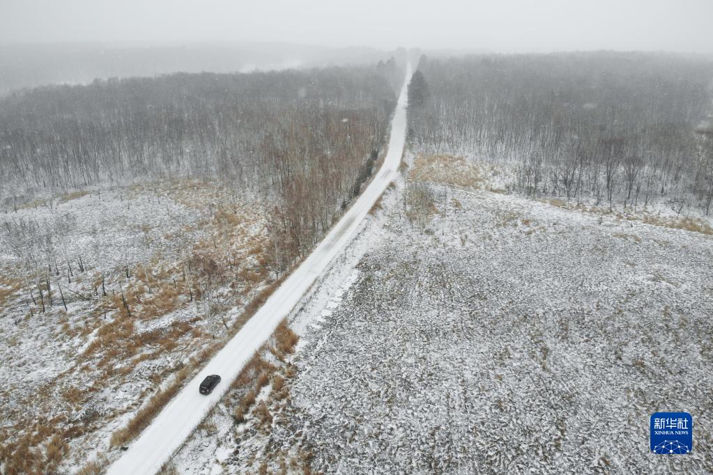 3月23日,在中國龍江森工集團沾河林業(yè)局有限公司施業(yè)區,王劉洋駕車(chē)和妻子徐盼、父親王學(xué)堂一起前往彩芹瞭望塔(無(wú)人機照片)。