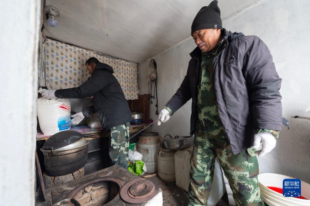 3月23日,在彩芹瞭望塔的塔下小屋內,王學(xué)堂(右)準備生火燒炕。