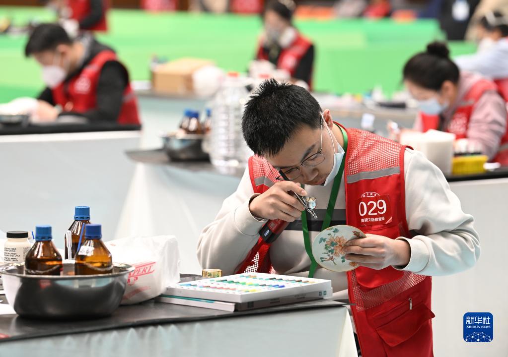 參加陶瓷文物修復師比賽項目的選手在現場(chǎng)進(jìn)行文物修復(3月25日攝)。