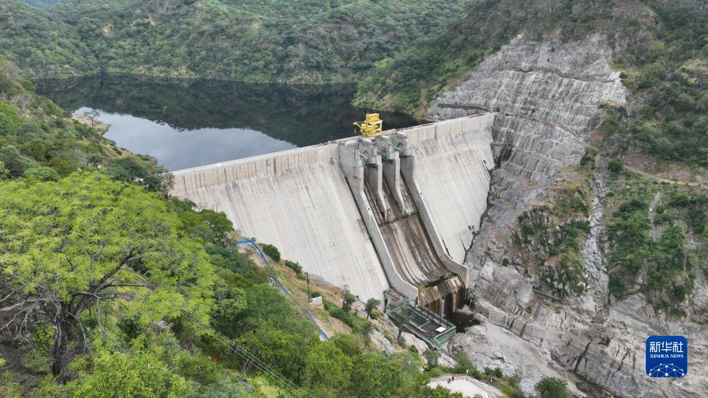 這是3月23日在贊比亞南方省航拍的下凱富峽水電站大壩。