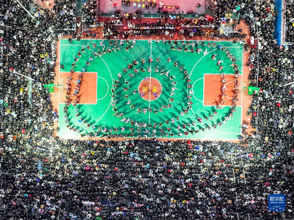 3月26日,比賽開(kāi)始前,苗族同胞在“村BA”賽場(chǎng)上跳舞(無(wú)人機照片)。