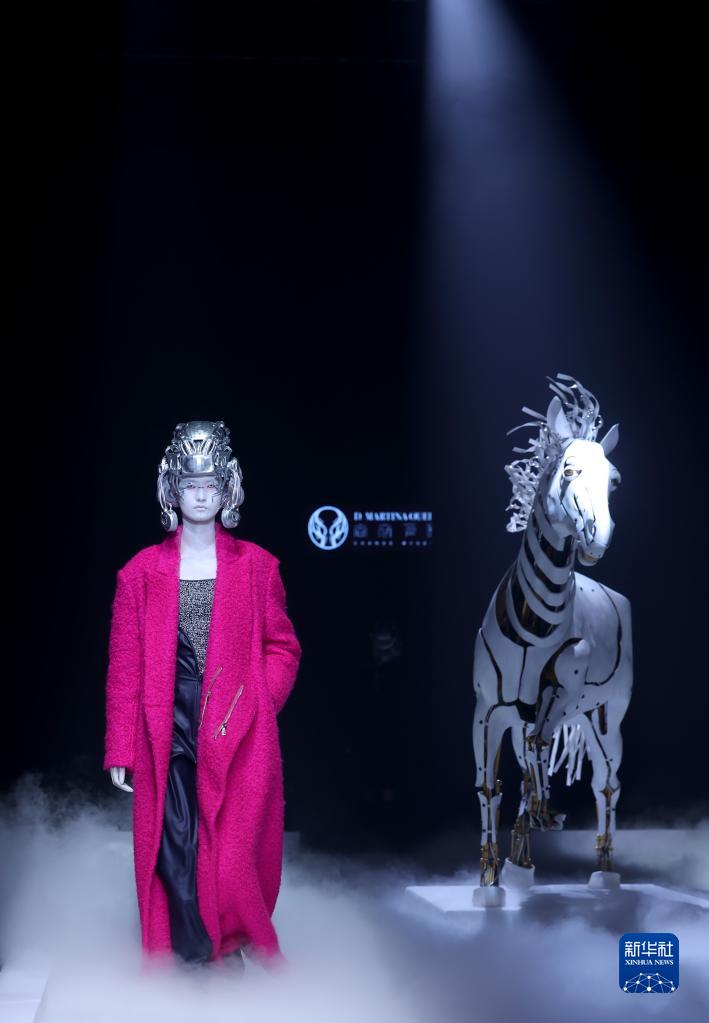 當日,主題為“視界·邊界”的時(shí)裝秀在北京舉行的中國國際時(shí)裝周2023秋冬系列上上演。設計師丁潔以婦好鸮尊為設計靈感,模特佩戴3D打印發(fā)飾,繞行秀場(chǎng)特別設置的“戰馬”,上演了一場(chǎng)歷史與未來(lái)“時(shí)空對話(huà)”的時(shí)裝秀。