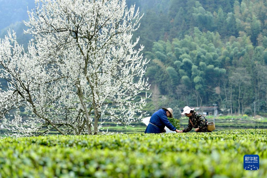 3月27日,茶農在湖北省宣恩縣椒園鎮慶陽(yáng)壩村的茶園采茶。