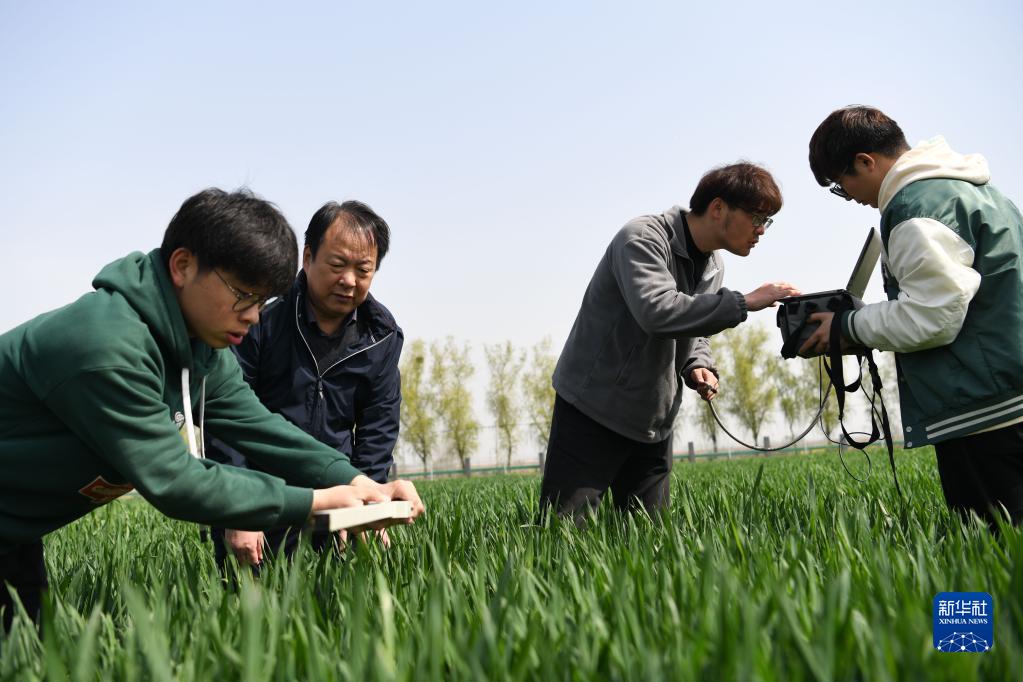 3月26日,在皖中綜合試驗站內,安徽農業(yè)大學(xué)新農村發(fā)展研究院副院長(cháng)黃正來(lái)(左二)在麥田里指導學(xué)生進(jìn)行小麥冠層測量。