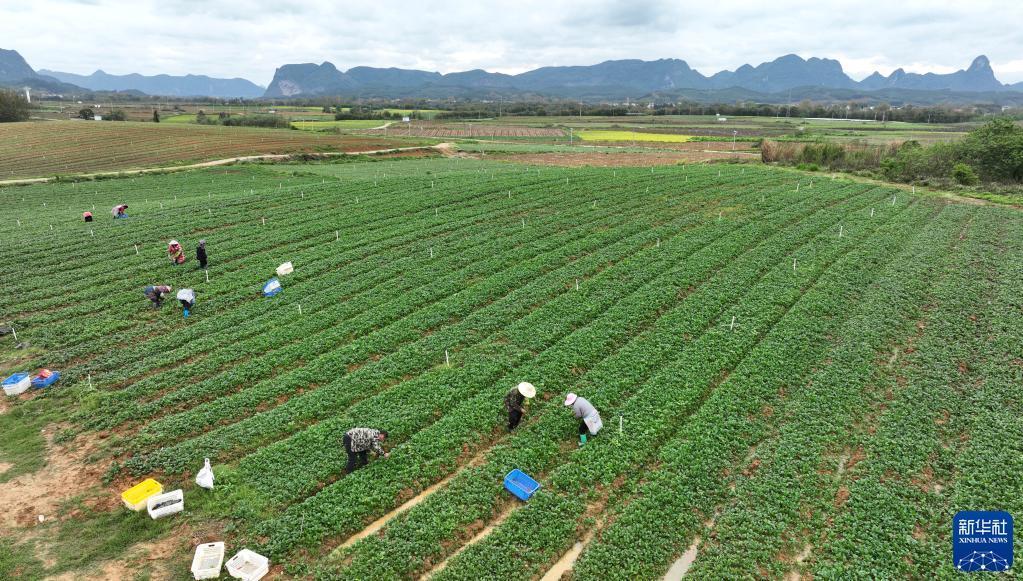 3月27日,在柳州市柳城縣社沖鄉柳州螺螄粉原材料基地里,農民在蔬菜基地里采摘蔬菜(無(wú)人機照片)。