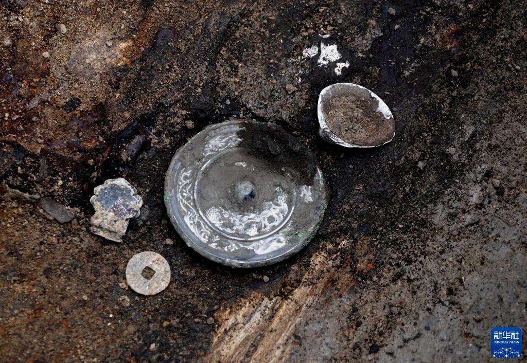 這是宋國故城遺址內的唐代墓葬出土的銅錢(qián)、銅鏡等(3月25日攝)。新華社記者 李安 攝