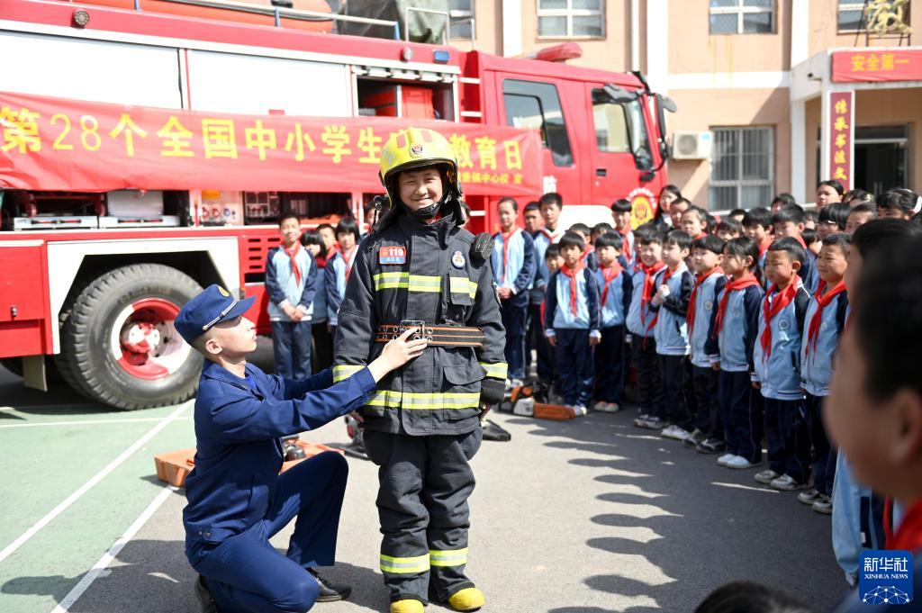 3月27日,在河北省邯鄲市肥鄉區毛演堡鎮中心校,學(xué)生體驗穿戴滅火防護服。