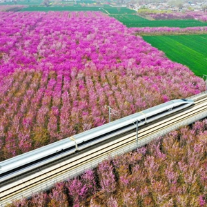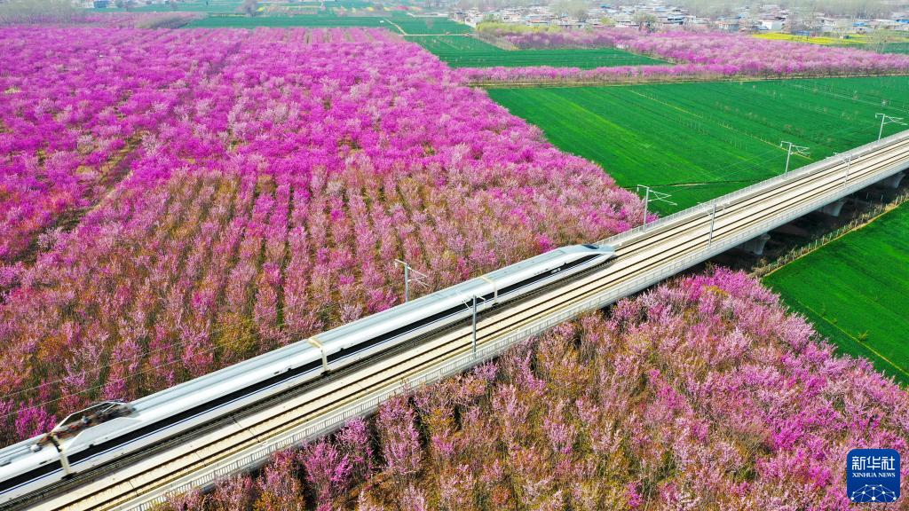 3月27日,高鐵列車(chē)從許昌市建安區小召鄉紫荊花海中駛過(guò)(無(wú)人機照片)。