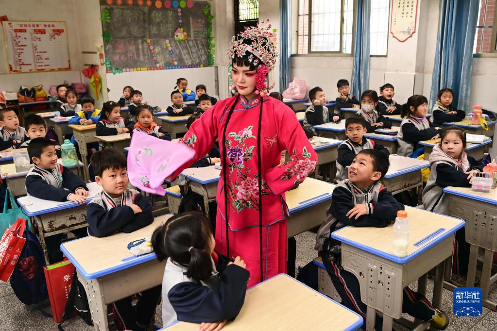 當日是世界戲劇日,江西省宜春市萬(wàn)載縣花燈戲劇團演員來(lái)到當地第二小學(xué),為學(xué)生們講解和表演花燈戲,讓孩子們近距離感受傳統戲劇文化的魅力。