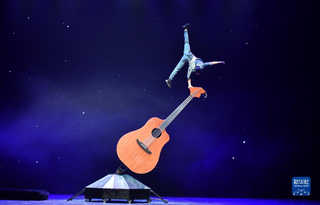 3月27日晚,在位于山東省濟南市的山東劇院,演員表演雜技節目《弦》。
