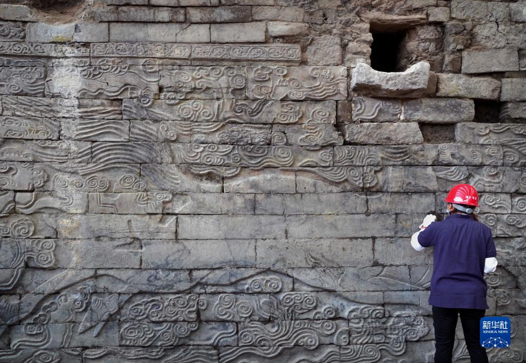 工作人員在清理河南開(kāi)封州橋遺址出土的巨幅石雕祥瑞壁畫(huà)(2022年9月21日攝)。